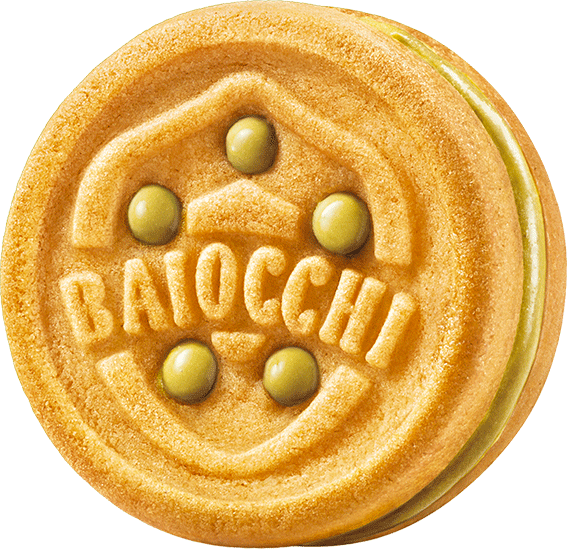 Ciastka Baiocchi Pistacchio to dwa pachnące kruche ciasteczka o niepowtarzalnym kształcie, połączone pysznym miękkim nadzieniem przygotowanym ze 100% włoskich orzechów pistacjowym.